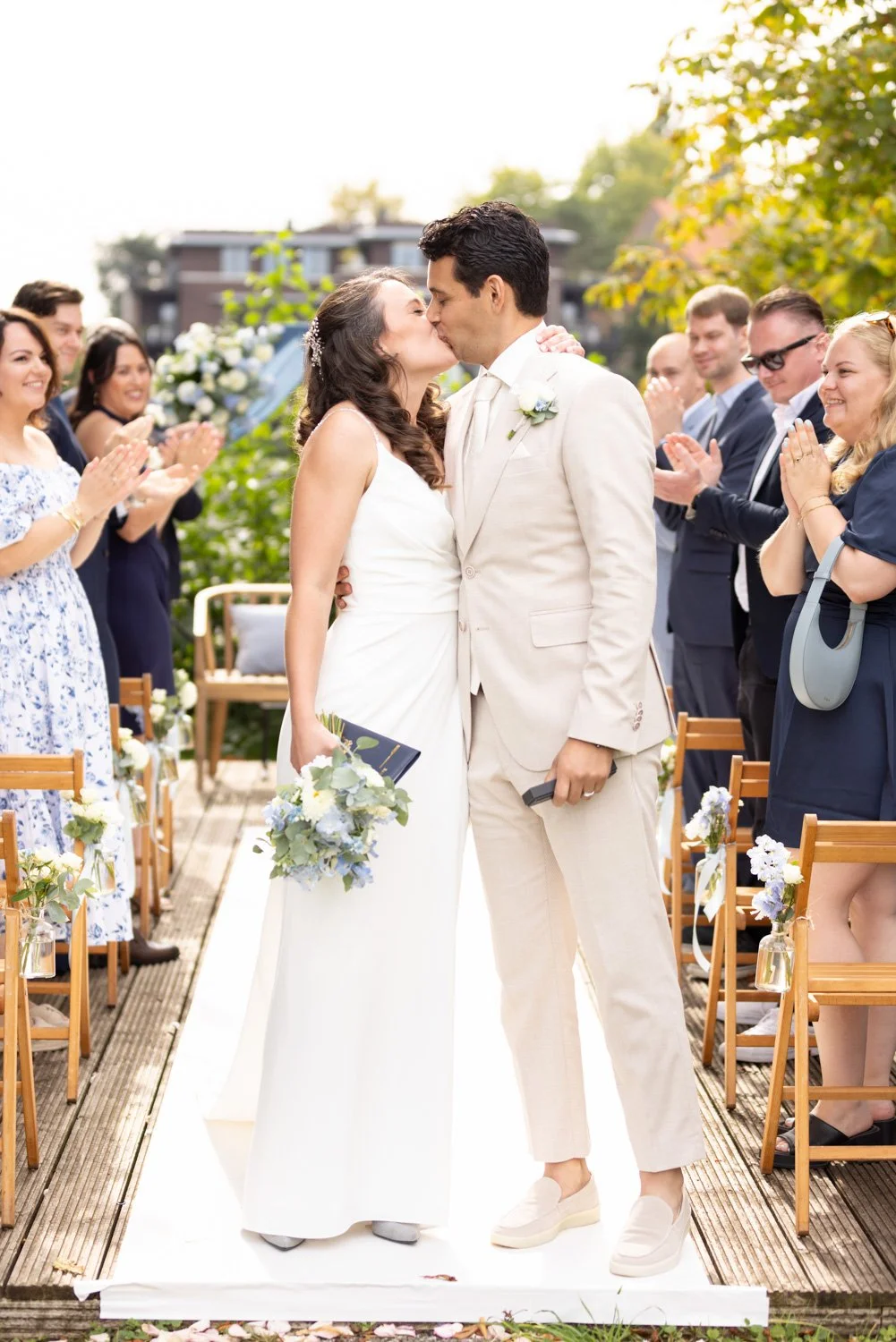 De ceremonie vond buiten plaats bij Lommerrijk, met uitzicht over het water. De styling en bloemendecoratie door 2Style gaven de ceremonieplek een prachtige, zorgvuldig opgebouwde setting die perfect aansloot bij de omgeving. De ceremonie werd begeleid door trouwambtenaar Yvonne Kien, die samen met het bruidspaar en hun persoonlijke geloften zorgde voor een ontspannen en intieme sfeer. Hun twee Welsh Corgi’s speelden een bijzondere rol en brachten de ringen naar voren, een moment dat zorgde voor zowel ontroering als een glimlach bij de gasten.